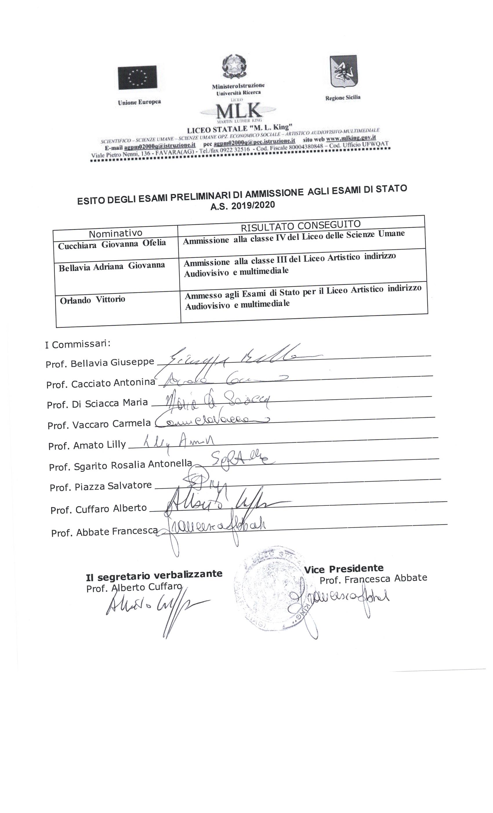 ESITO DEGLI ESAMI PRELIMINARI DI AMMISSIONE AGLI ESAMI DI STATO A.S.2019/2020